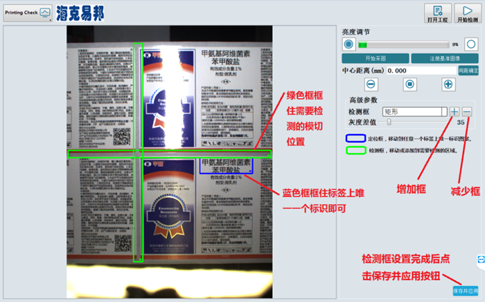檢測時實時定位商標特定圖案,給出當前位置的初始位置的偏差,檢測區(qū)域位置自動補償,實現(xiàn)產(chǎn)品自動定位功能。
