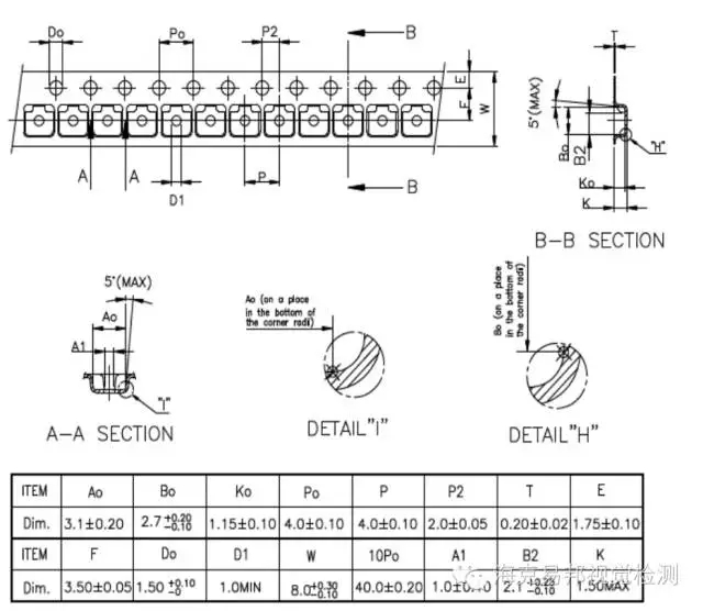 2、尺寸檢測(cè):兩個(gè)圓心的距離、檢測(cè)圓孔是否有變形、包裝帶的總寬度、包裝帶方格的長(zhǎng)寬。檢測(cè)精度:見以下圖紙要求。
