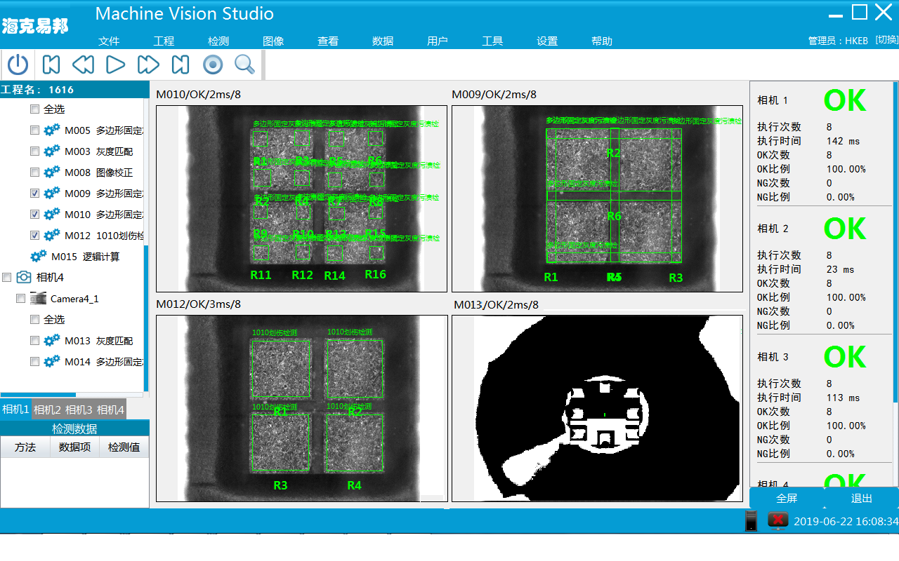 “HK-V6500N視覺控制器”,應(yīng)用于四相機(jī)LED缺陷檢測,搭載視覺處理軟件MVS,采用交叉點(diǎn)定位或者匹配定位基于二值化、圖像校正插件、LED極性判斷、LED缺角檢測、LED亮色缺陷檢測、LED邊緣變形檢測等插件,實(shí)現(xiàn)LED缺陷檢測能。